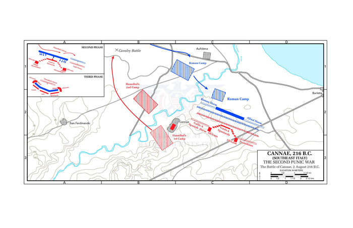 Map for the Battle of Cannae in southeast Italy, where Hannibal absolutely hammered the Roman Army on 2 August 216 BC. Cannae is viewed by many as the worst defeat of the Roman Army and one of the more spectacular victories in warfare. Although Hannibal scored a decisive victory, he could not parlay the victory into winning the Second Punic War.