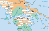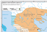 Map showing the players at the start of the Second Macedonian War in 200 BC. Rome would win the war in 197 BC, forcing Philip V of Macedon to give up all possessions in southern Greece, Thrace, and Asia Minor.