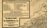 This meticulously detailed illustration showcases Colorado Springs' carefully planned street grid spreading across the high plains, with the majestic Pikes Peak dominating the skyline. Every structure—from grand hotels and sanitariums to elegant Victorian homes and commercial blocks—tells the story of a community built on health tourism, military presence, and silver mining wealth. The map's comprehensive index highlights points of interest throughout the city, offering a window into the landmarks and districts that made Colorado Springs one of America's most fashionable mountain destinations.