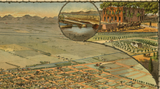 The Map’s Features This bird’s-eye view highlights the rectilinear street plan of early Phoenix, extensive irrigation canals feeding orchards and farmland, civic buildings and commercial blocks clustered at the town center, and the surrounding desert landscape transitioning into cultivated land. Decorative vignettes depict prominent buildings, canal infrastructure, and local scenes that emphasize the city’s reliance on water and agriculture.