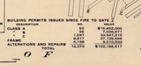 - Features: Red-shaded burned area (4 square miles), black markings for new construction, building permit statistics