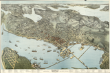 Step into Seattle at the height of its late-19th-century transformation with this richly detailed 1891 bird’s-eye view. Looking south across Elliott Bay toward the city and surrounding hills, the map captures Seattle as a rapidly growing port town shaped by maritime trade, rail expansion, and ambitious urban planning. The hand-colored panorama vividly illustrates the dense waterfront, expanding street grid, wooded hillsides, and bustling harbor filled with sailing vessels and steamships.