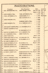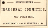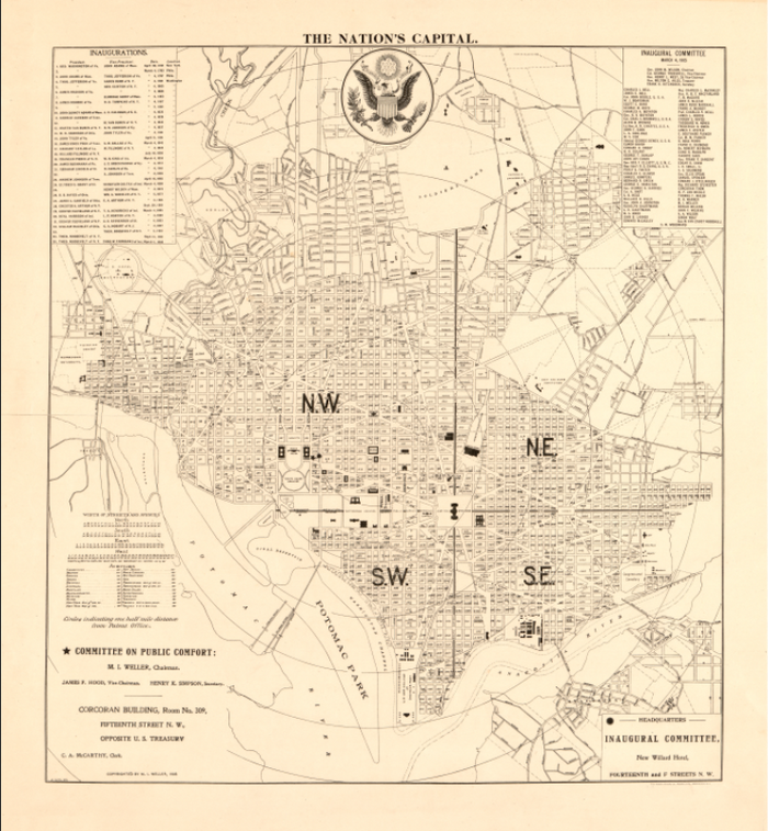 This city map shows Washington divided into its four quadrants—NW, NE, SW, and SE—with a precise street grid, block numbers, radial distances, and major civic landmarks clearly identified. It includes the locations of the “Committee on Public Comfort” and the “Inaugural Committee,” highlighting how the city organized transportation, public services, and crowd management for inauguration day. Surrounding tables list every U.S. presidential inauguration up to 1905, provide a directory of inaugural officials, and document street widths throughout the city. The U.S. coat of arms at the top reinforces the map’s ceremonial and national character.