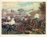 Hand drawing of the battle of the battle showing the Confederate cavalry overrunning Union artillery. Bottom left corner states "July 21st 1861, Federal (Gen. McDowell) Loss: 481 Killed, 1011 Wounded, 1460 Missing...Confederate (Gen. Beauregard) Loss: 378 Kd, 1489 Wd, 30Mg."