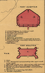 Map showing Charleston Harbor and its defenses with distances shown from Fort Sumter (spelled Sumpter on this map). Also included are basic outlines of Forts Sumter and Moultrie and Castle Pinckney.