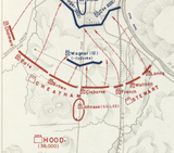 Side by side maps showing the advance of Hood towards the Union strongholds. The map on the left shows the situation at 3:30pm and the map on the right shows the extent of the Confederate advance at 4pm.