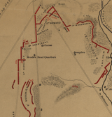 Map showing great detail of the Confederate commanders, going down to the brigade level. This map also shows more detail to where the wooded areas on the battlefield were. Union defensive lines are very precise.