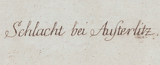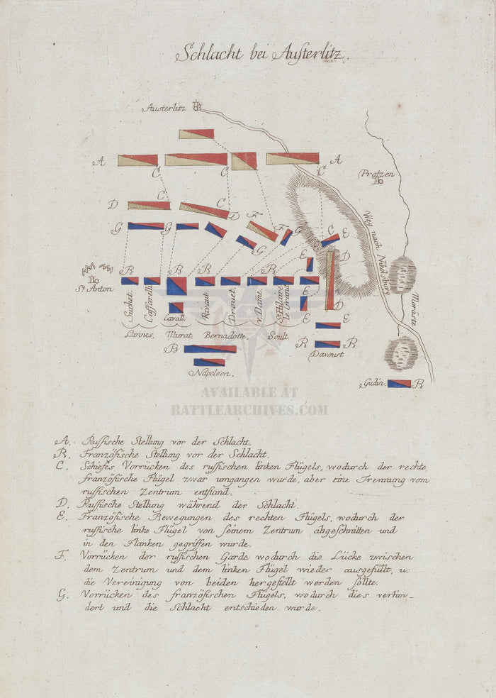 Battle map of Austerlitz, which is considered one of the most perfect military victories in all of military history. Austerlitz was fought on 2 December 1805 in modern day southeast Czech Republic. The outnumbered Napoleon defeated Russian Tsar Alexander I and Holy Roman Emperor Francis II. The result led to the collapse of the Holy Roman Empire for good. Map is in German.