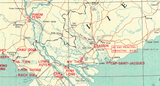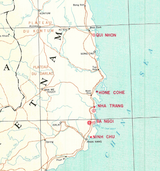 Map of the entire country of Vietnam to include Laos, Cambodia, and parts of Thailand and China. The focus of this map is on the ports and naval facilities throughout the region, with cities such as Saigon, Hue, Haiphong, and Hanoi shown. Some military operating bases are annotated.