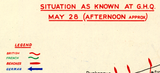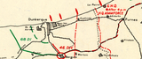 Allied map showing the Battle of Dunkirk on 28 May 1940 (battle went from 26 May to 4 June 1940). You can clearly see the outer defensive lines and how the Germans had them completely surrounded. Of note, this British map shows friendly British forces red and enemy German forces in blue, which normally friendly is blue and enemy is red.