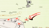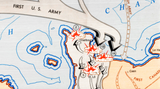 Campaign across Europe of the First US Army with descriptions of the major events, such as D-Day, Paris, Battle of the Bulge, and surrender/Soviet contact. Inset showing the Battle of the Bulge.