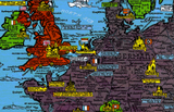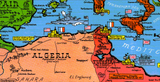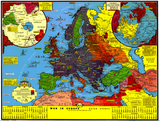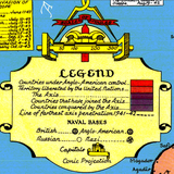Colorful map showing World War 2 into 1944. The progress of the Allies show 1943, but there are references to events in spring 1944. It was actually created as a calendar, complete with days and months of 1944.