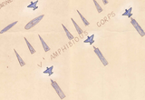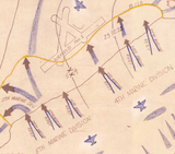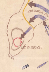 This hand drawing shows the amphibious assault route taken to the beach and then the route across the island towards complete victory. Note the Marine regiments are shown where their amphibious landings took place. Also shown is the location of the USS Bismarck Sea, which was sunk in 21 February and the last American carrier to be sunk during the war.
