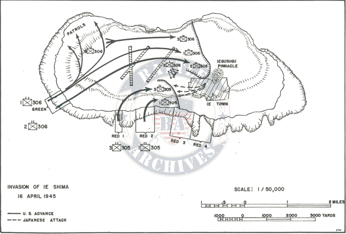 This map is of Ie Shima (now called Iejima), just off the coast of Okinawa. There was a five day battle on the island from 16-21 April. It is most commonly known as where famed war reporter Ernie Pyle was killed by a Japanese machine gunner.