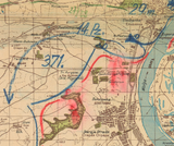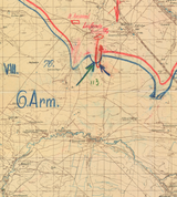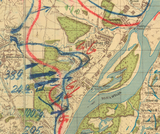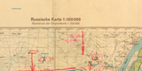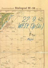 Especially rare and important Wehrmacht map showing German offensive and defensive operations in and around Stalingrad on 27 September 1942. This German map was later captured by the Soviets. The topographical map is labeled: "Stalingrad M-38." It was printed by the Wehrmacht in Warsaw, an overprint with German names over an existing Russian map. A great deal of detail is revealed on the map, with German forces and front lines shown in blue grease pencil and Russian forces shown in orange. The map is dated at upper-right "27.9.42" which was the same day that the fighting shifted north to the industrial district. Having slowly advanced over ten days against strong Soviet resistance, 51st Army Corps was finally in front of the three giant factories of Stalingrad: The Red October, Barricades and Tractor Factory. The advance is clearly depicted on the map, with the blue German lines drawn and re-drawn as the various labeled elements of the 51st Army are shown advancing northward, with two Russian counter-attacks, one repulsed. Other German forces shown include the 6th Army, 4 Panzer Army, XIV Panzer, 16. Panzer, Kampfgruppe Stahel, XXXXIII Panzer, and more. A Russian assault from the south has been erased, having been indicated in error or more likely been swept back. In the north, two Russian probing attacks are shown as well. At the bottom of the map, there is a pencil notation in Russian, untranslated.