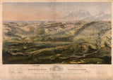 Pictorial representation of all three days of the Battle of Gettysburg. The view is looking northwest, with the town of Gettysburg on the right and the southern point of the Union lines on the left. This map has amazing detail to include the names of the leaders of the units engaged.