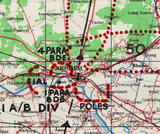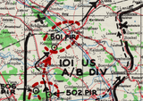 Detailed map showing all the objective areas and drop zones. The entire operational corridor can be seen with Market (the airborne portion of the operation) and Garden (the land advance). US 82nd and 101st Airborne DZ's are annotated.
