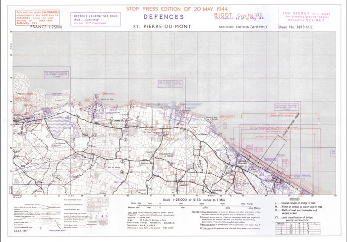 This map shows the western beaches of Omaha (Easy Green, Dog Red, Dog White, Dog Green) and Point Du Hoc further west. This map is Copy No 193 with information current as of 19 May 1944. Potential German artillery and mortars locations are also annotated.