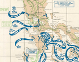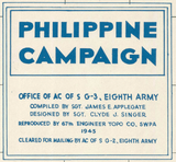 Map of the Philippines Campaign of 1944-45. This map was created by the G-3 section of the Eighth Army. Amphibious and Airborne landings and their inland movements are annotated. Units are at the division level. Note: The longitude markings in the top left are slightly cut off due to the original scanning (at a government facility) not catching the last few millimeters of the scan.