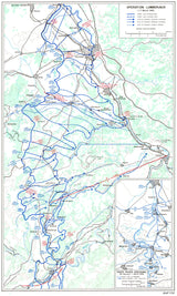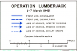 Operation Lumberjack took place from 1-7 March 1945 and was the Allied push to gain and hold the western bank of the Rhine river. This map shows units under Hodges' 1st Army as they approached and captured cities such as Cologne, Bonn, and Koblenz. Note the Ludendorff Bridge at Remagen is annotated.