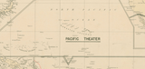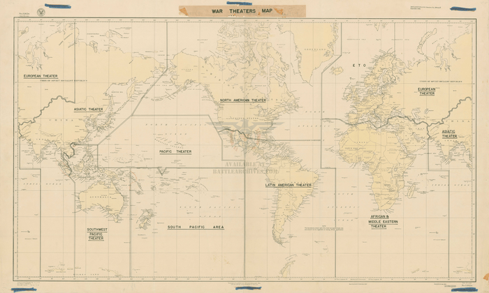 American made world map showing the boundaries of the geographic theaters of war. Theaters include North American, European, Asiatic, Southwest Pacific, South Pacific, Pacific, Latin American, and African & Middle Eastern. Lots of markings from the original were preserved on this print.